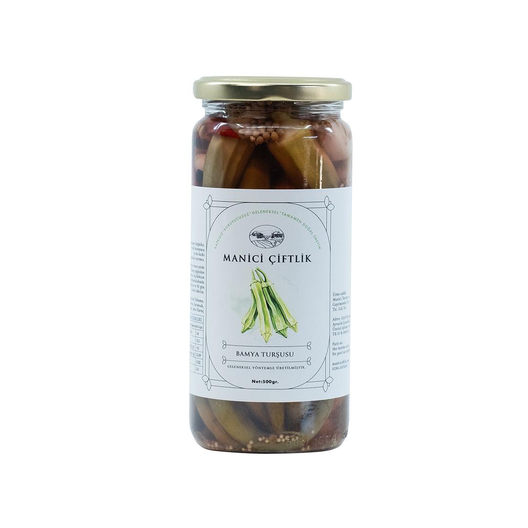 Manici Çiftlik’in tarlalarından özenle toplanan taze bamyalar, geleneksel yöntemlerle hazırlanarak Bamya Turşusu olarak sofralarınıza ulaşıyor. Tamamen doğal ve katkısız olan bu turşu, fermente süreci boyunca besin değerini koruyarak, bamyanın kendine has lezzetini ve gevrek dokusunu ortaya çıkarır.